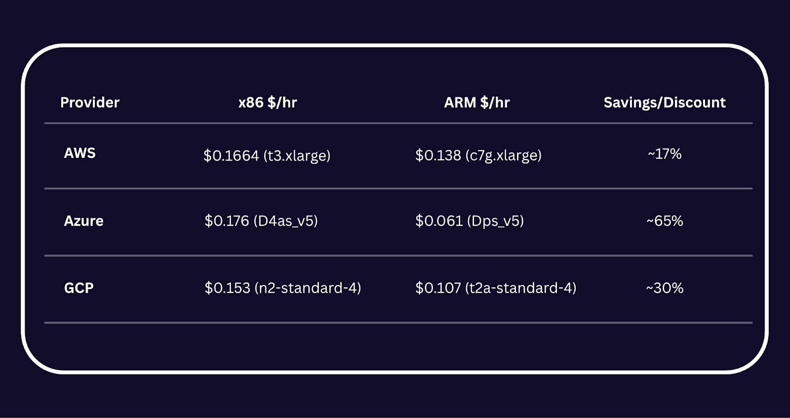 - Azure has the highest pricing gap: 65%+ savings on compute workloads using Arm-based chips.