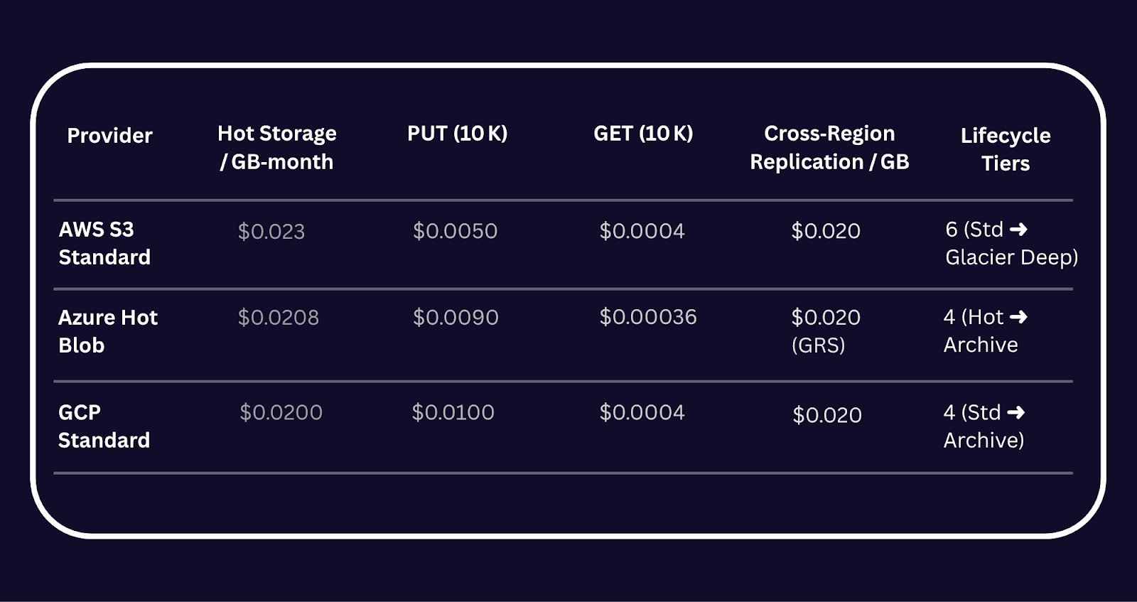 - Cold tiers: AWS Glacier Instant Retrieval ($0.004 /GB) is now more expensive than GCP Archive ($0.0012 /GB) but offers millisecond access.