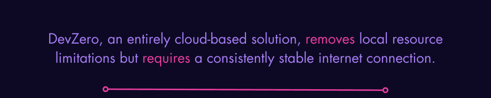 DevZero, an entirely cloud-based solution, removes local resource limitations but requires a consistently stable internet connection. Local tools such as Rancher Desktop require powerful development machines. Teams need to estimate the storage, computing, and network needs for their container workloads.